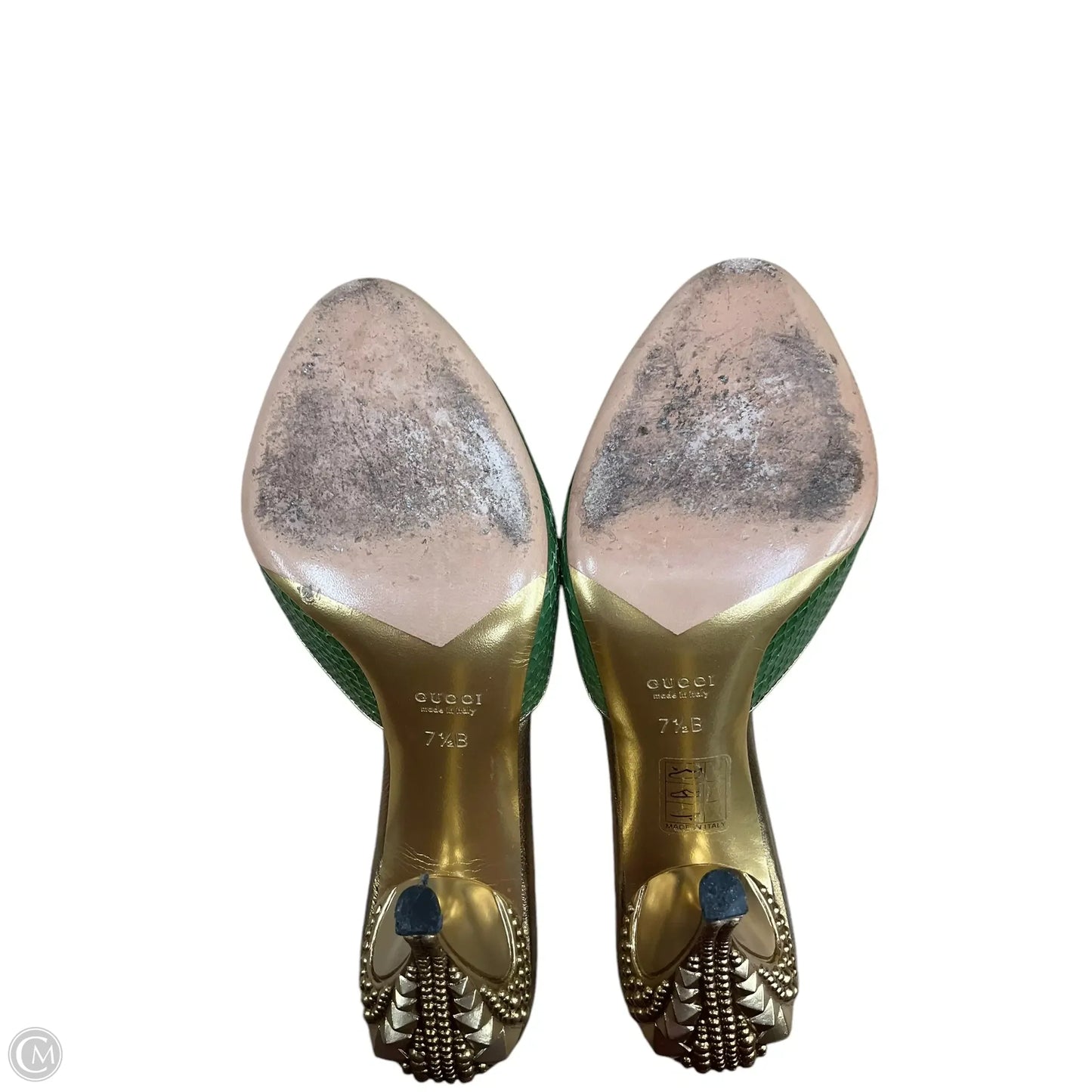 Step into luxury with these Gucci sandals in dazzling gold and green. Size 7.5. Unleash your inner fashionista with these statement shoes. Flaunt your style with confidence.
